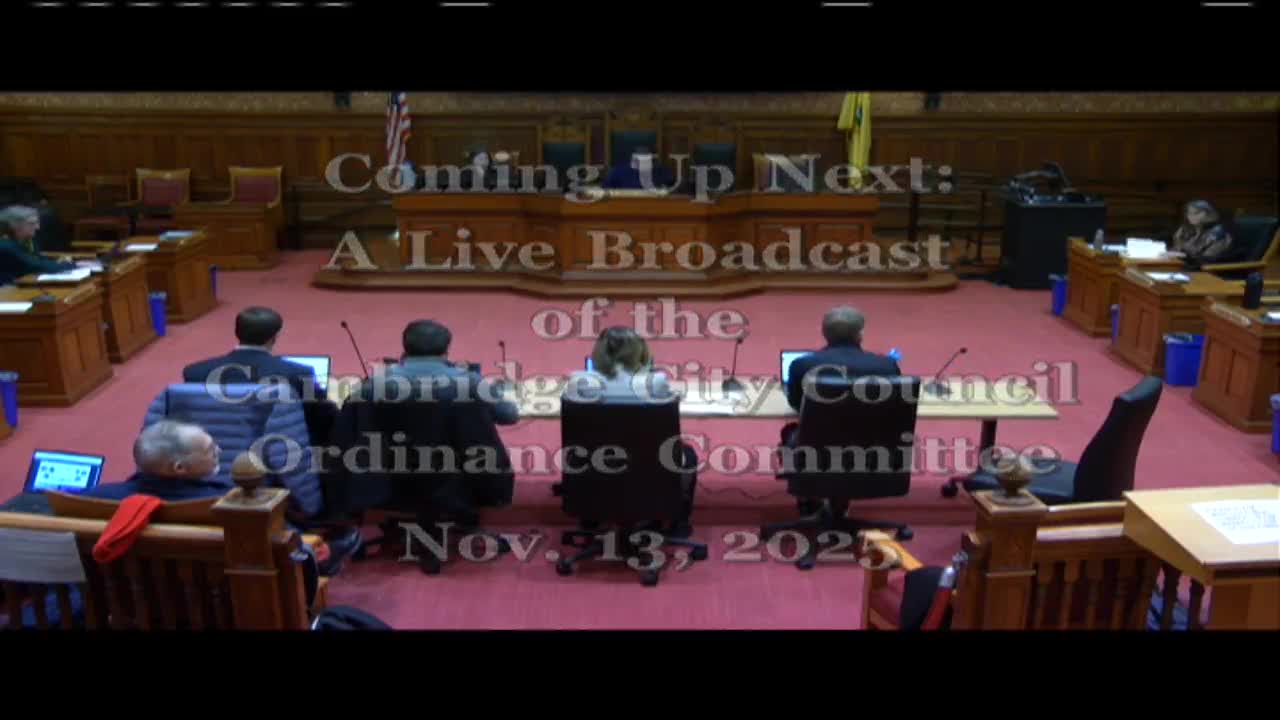 The Cambridge City Ordinance Committee on Nov. 13 continued its review of two linked zoning petitions that would reshape development rules along the Massachusetts Avenue and Cambridge Street corridors, including higher as-of-right heights and incentives for active ground-floor uses. Vice Mayor McGovern presided and the committee voted to recess and reconvene on Dec. 2 for additional public comment and follow-up.