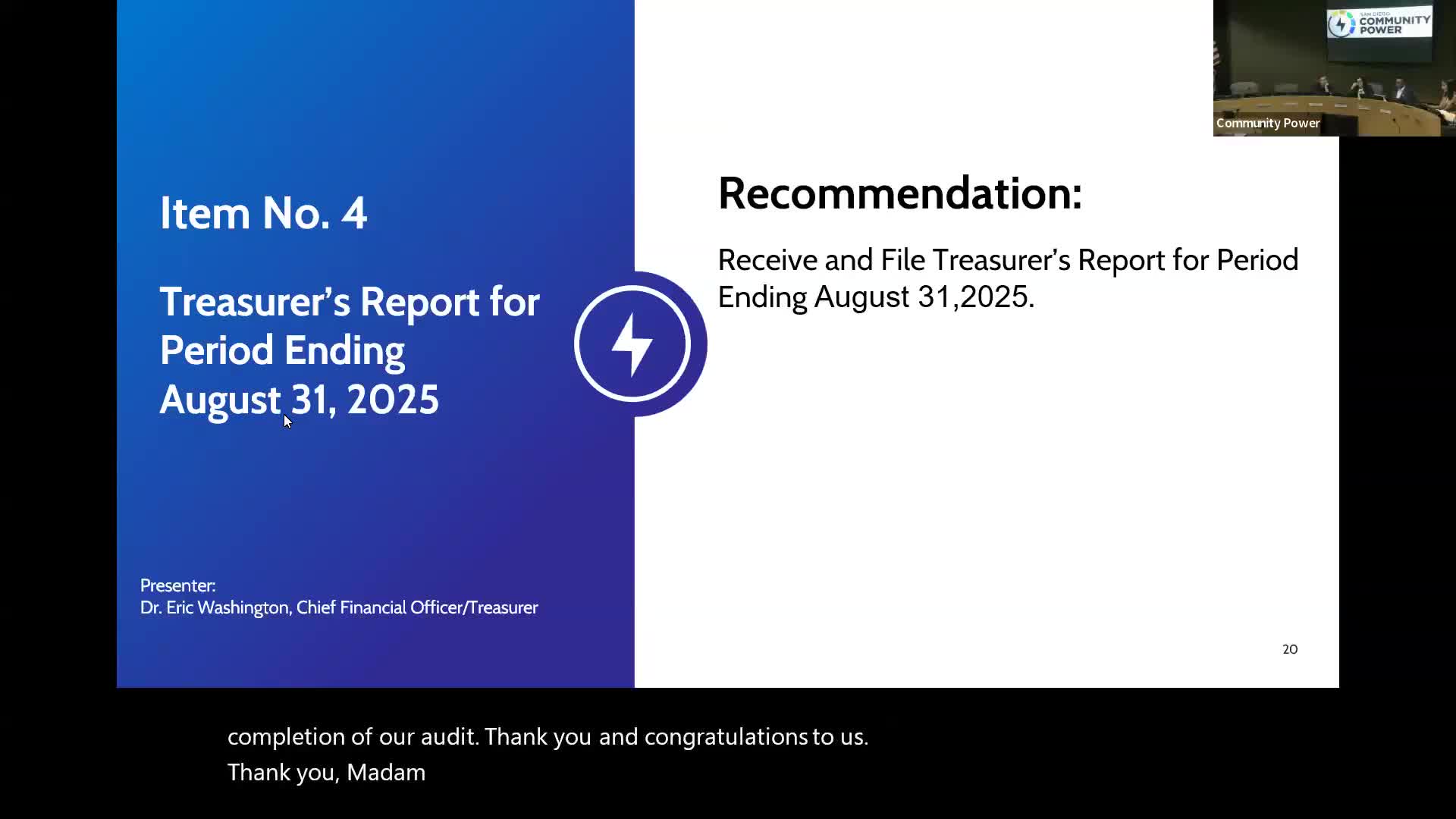 Dr. Eric Washington, chief financial officer and treasurer of San Diego Community Power, presented the treasurer’s report for the period ending Aug. 31, 2025, reporting year-to-date net revenue of $308,700,000 compared with the budgeted $318,000,000. Washington attributed the revenue variance primarily to lower customer demand resulting from cooler-than-expected temperatures and said operating expense underspending contributed about $13,300,000 to the period’s net position.