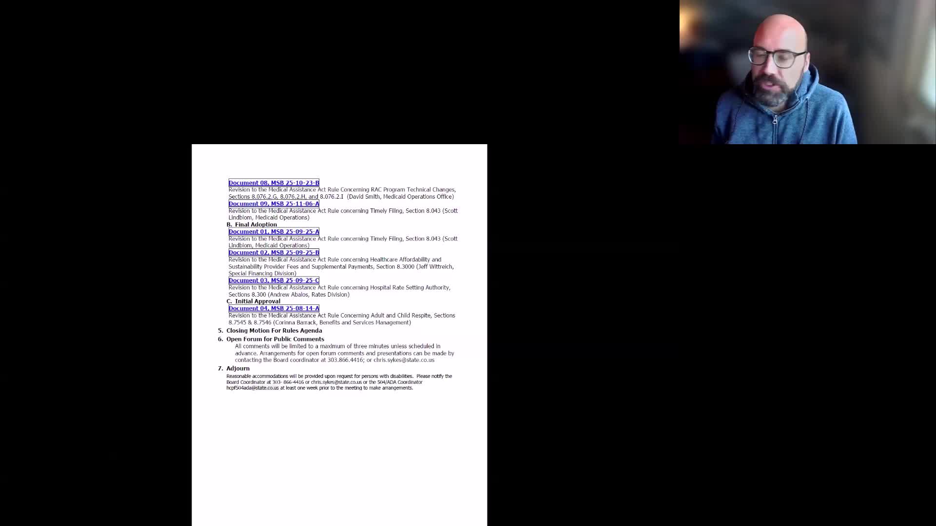 Jeff Witrick (Provider Fee Unit) presented final-adoption revisions to MSB 25-09-25-b that update per-diem fees for federal fiscal year 2024-25 so fee collections match the state’s funding obligations and federal draw-down plans under the CHASE mechanism. "What these rules do is simply revise the per diem fees that we need to collect so that the amount of fees we could collect match the funding obligation for federal fiscal year 24-25," Witrick said.