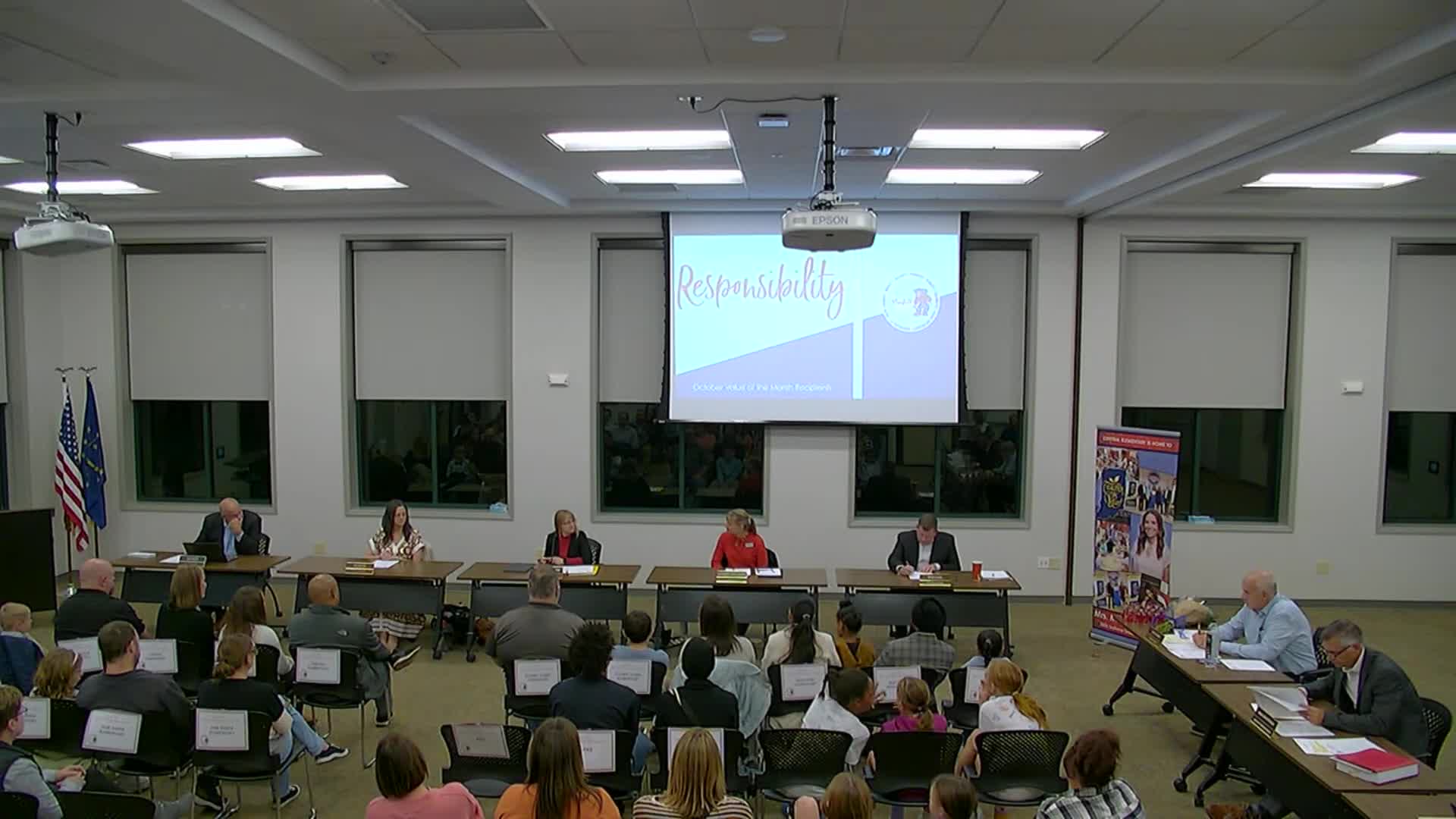 Board members and administrators also presented student awards for October's value of responsibility, honoring winners from multiple elementary and middle schools. The meeting paused briefly for photos following the recognitions.