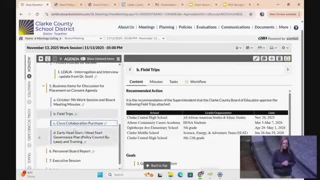 After questions about a long-standing state contract and local disparity goals, the Clarke County School Board voted to table approval of a Cisco phone-system renewal to December so staff can provide procurement details and alternatives.