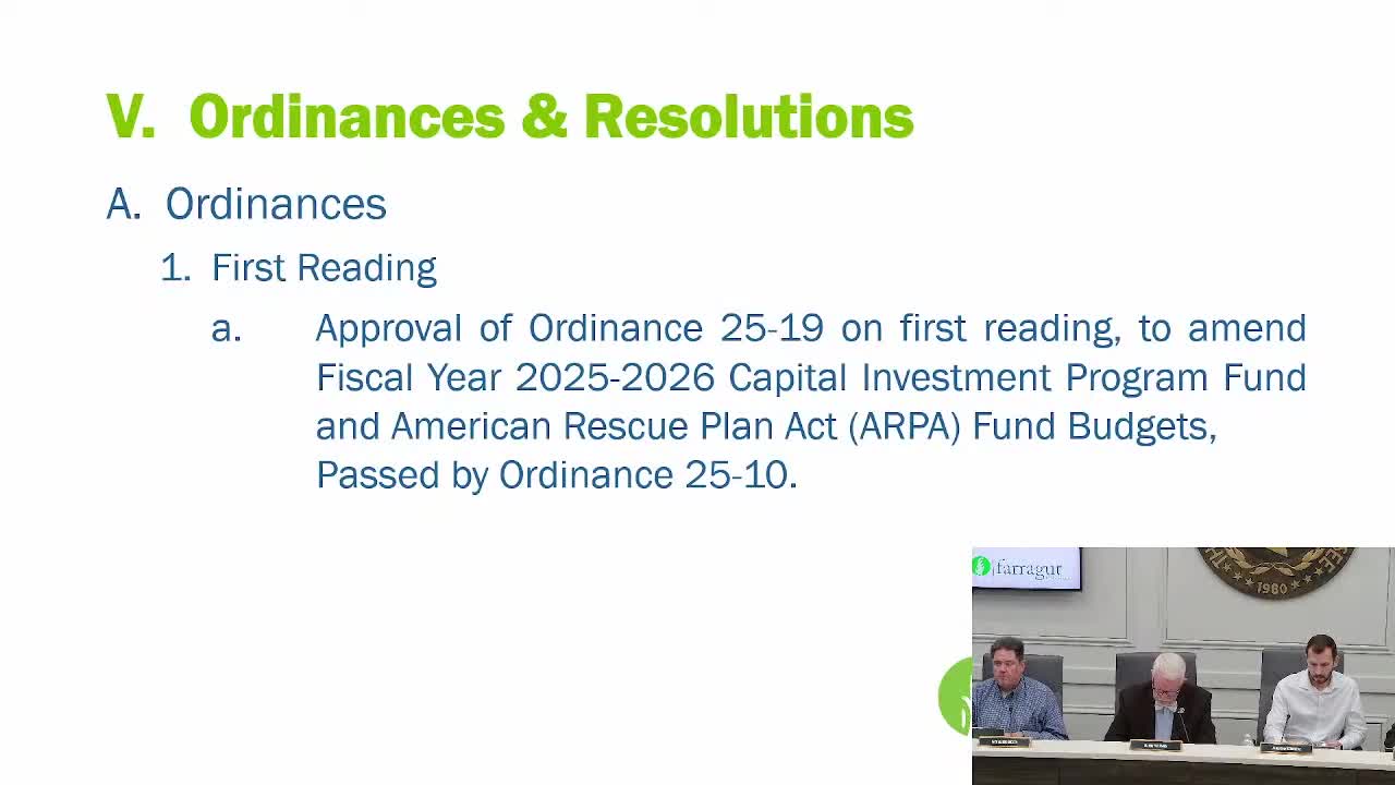 Staff told the board Ordinance 25-19 will transfer $6,089,416.29 from the CIP available fund balance into FY2026 CIP expenditures, and move $132,589.25 from ARPA reserves into ARPA expenditures, plus an additional $25,000 from ARPA reserve to cover change order No. 2. The board approved the ordinance on first reading by roll call, 5–0. Mark Shipley, planning staff, told the board the code update in Ordinance 25-15 restores purpose-and-intent language, adds severability and conflict clauses and streamlines approvals for straightforward driveway variances; the board approved that first reading by roll call, 5–0.