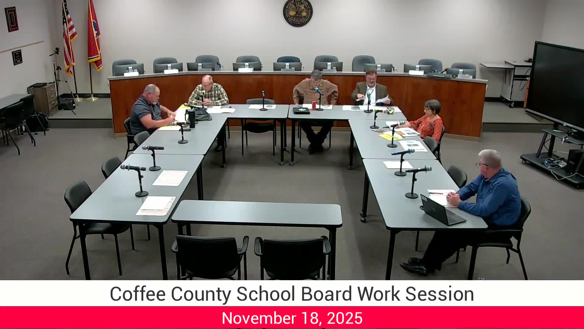 The Coffee County Schools board reviewed a draft five-year strategic plan covering student outcomes, staff, supports, stakeholders and safety, tied to the LEA/TISA process; the board will consider approval at its December meeting and asked staff for a public safety spending breakdown.