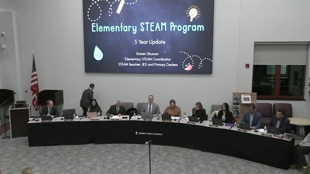 Kristen Schumann, the Summit Public School District STEAM coordinator at Jefferson Elementary School, presented a five‑year update on the district’s K–5 STEAM program, describing dedicated STEAM labs in every elementary school and a curriculum built around robotics, coding, science units and year‑end design challenges.