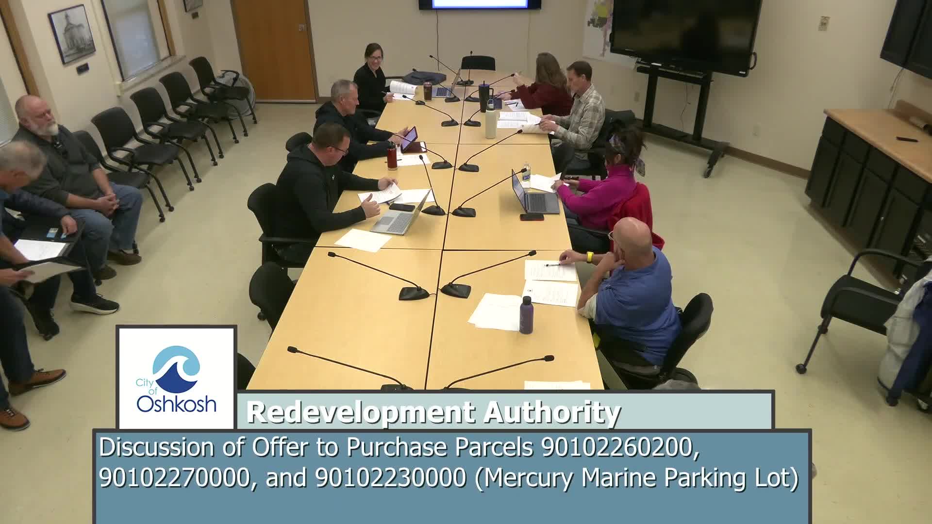 The Oshkosh Redevelopment Authority voted to approve Resolution 25-11, authorizing the sale of three lots commonly used as the Mercury Marine parking area to Brunswick Corporation for a purchase price reported as $48,000.