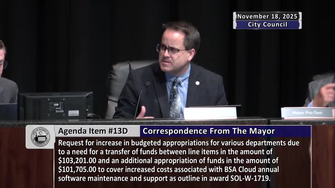 Councilman Lafferty raised concerns that invoices were dated Sept. 1 and were being approved retroactively in November, and he urged the city attorney’s office to pursue a multi‑year support and maintenance agreement to obtain more favorable pricing and stability (SEG 1896–1966). Lafferty told colleagues the city is unlikely to abandon BS&A, described the suite as the system staff use across multiple departments, and recommended counsel negotiate 3‑ to 10‑year options to reduce future cost risk.