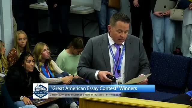 Carson City trustees paused business to celebrate student achievements: winners of the Great American Essay Contest across elementary, middle and high school levels (first‑place prizes of $100 at the elementary level noted) and the Carson High girls cross‑country team, which placed second at state and first in regionals were recognized and photographed.
