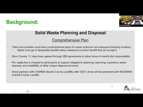 On disposal partners, Phillips said Boone County has limited expansion options and has expressed a desire not to accept increasing Story County volumes; the city has arranged to join the West Central Iowa Solid Waste Management Authority to use Carroll County Landfill, which has agreed to accept Ames loads for a minimum of 20 years. Phillips cautioned that siting a new landfill would take 5 to 7 years and entail significant political and regulatory hurdles.