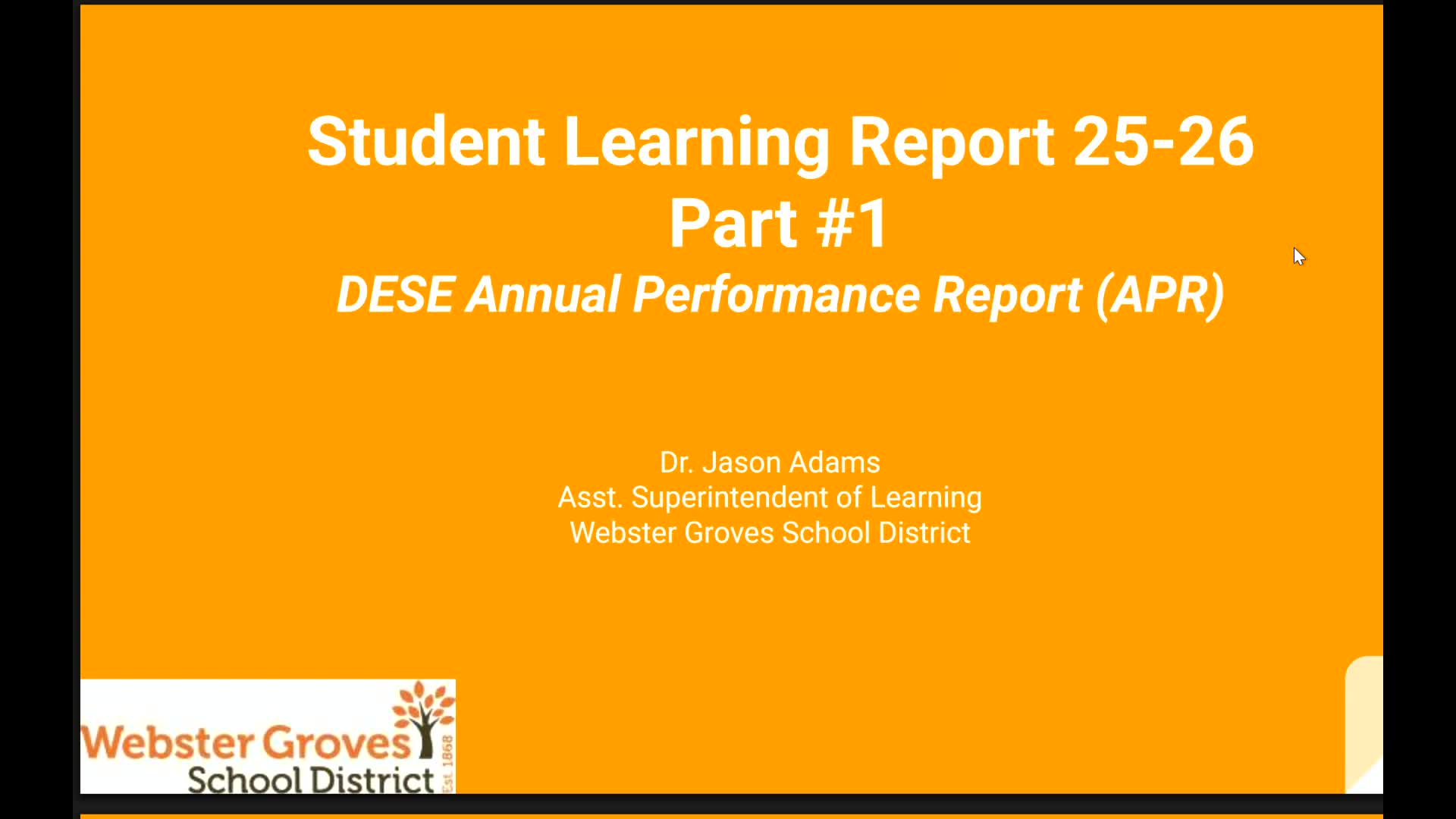 Superintendent staff presented the Webster Groves School District’s annual performance report from the Missouri Department of Elementary and Secondary Education (DESE), showing an overall APR of 88.7.