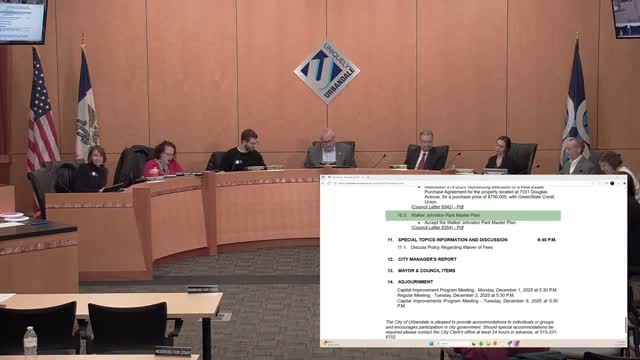 Urbandale accepted the Walker Johnson Park master plan as a conceptual, phased guide with Phase 1 focused on ball-field upgrades; members of the Fourth of July committee urged revisions to protect fireworks setback zones and raised insurance and permitting concerns.