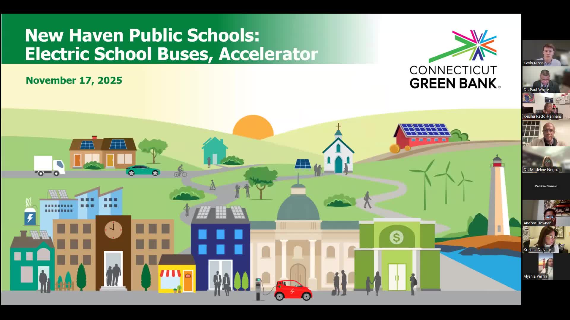 The Connecticut Green Bank presented a no‑cost accelerator planning service to help New Haven Public Schools assess electric-school-bus deployment, infrastructure costs and funding options; the committee discussed timing for joining a 2026 cohort and requested the accelerator agreement and slides for posting.