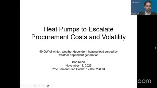 Bob Keane presented technical analysis warning that large-scale heat pump adoption could substantially increase New England’s winter peak and raise marginal generation costs. Keane described heat pumps as a low load factor, winter‑peaking addition whose marginal cost in some ISO studies rises much faster than load, citing an example where a 4.5% heat‑pump-driven load increase raised system costs by roughly 53% in a modeled year.