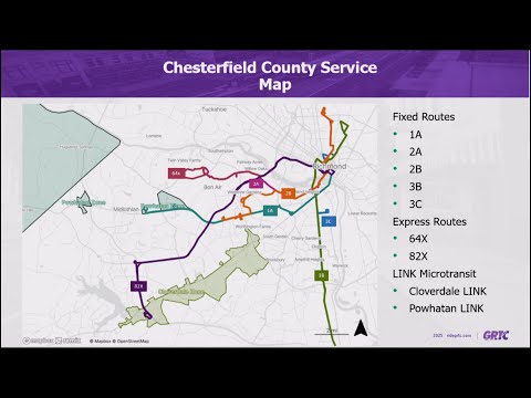 On Chesterfield service specifically, Adrian highlighted Route 1A (launched January 2024) as carrying roughly 180,000 riders per quarter; he said about 20% of those trips report Chesterfield stops as the destination. He also reviewed Routes 2A/2B and 3B/3C, and cited express routes 64 and 82 that serve Chesterfield park‑and‑ride locations. Adrian said Route 1A ranks among GRTC’s top three routes systemwide and that ridership increases coincide with service extensions and the fare‑free policy.