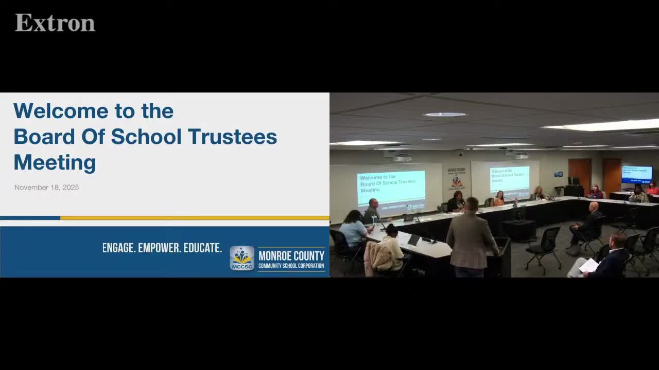 The district's redistricting study commission presented its research-driven process to the Monroe County Community Sch Corp board, describing goals to balance socioeconomic status within schools and to assess cost effectiveness.