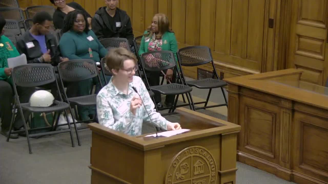 Annalise Skirpin, a University of Alabama social work student interning at Community Service Programs (CSP), urged the Tuscaloosa City Council to support residents who may face winter energy hardship while federal LIHEAP funds are delayed.