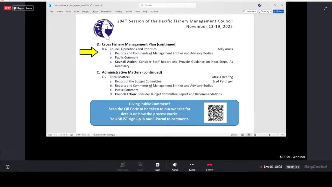 Kelly Ames and Executive Director Burden outlined staff proposals to reduce how often individual fishery management plans (FMPs) appear on the council agenda to address budget limits and staff workloads, and to clarify when advisory bodies should meet in person versus remotely. Advisory bodies weighed in: coastal pelagic and highly migratory species teams raised concerns about shifting benchmark assessments into constrained months; the groundfish GAP and GMT urged exemption from fully remote meetings when groundfish workload is heavy, citing the value of in‑person collaboration for complex harvest specification work.