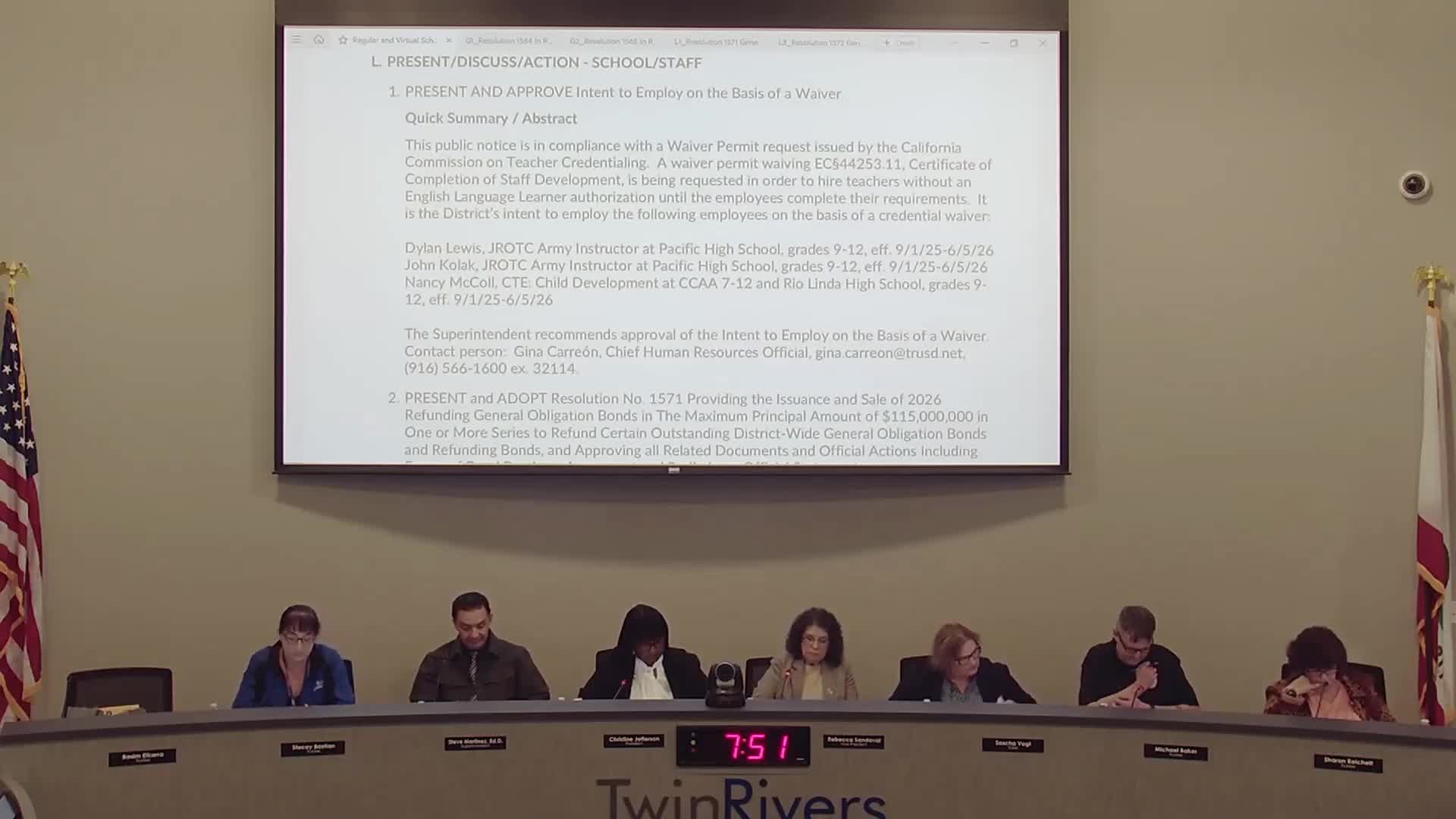 Staff also presented resolutions (1571 and 1572) authorizing the district to explore refunding opportunities for older 2016 general obligation bond issuances for the high‑school and elementary districts. Staff said any refinancing would proceed only if advisers and underwriters demonstrate net savings for taxpayers; trustees approved authorizing staff to move forward with analysis and, if savings are present, to complete refinancing steps.