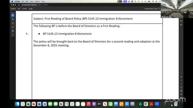 Board members reviewed a draft policy responding to Assembly Bill 699 that limits collection of family immigration status, restricts campus access by enforcement to nonpublic areas, and outlines response steps for warrants and requests; members asked legal counsel to tighten resource language and clarify public vs. nonpublic zones.