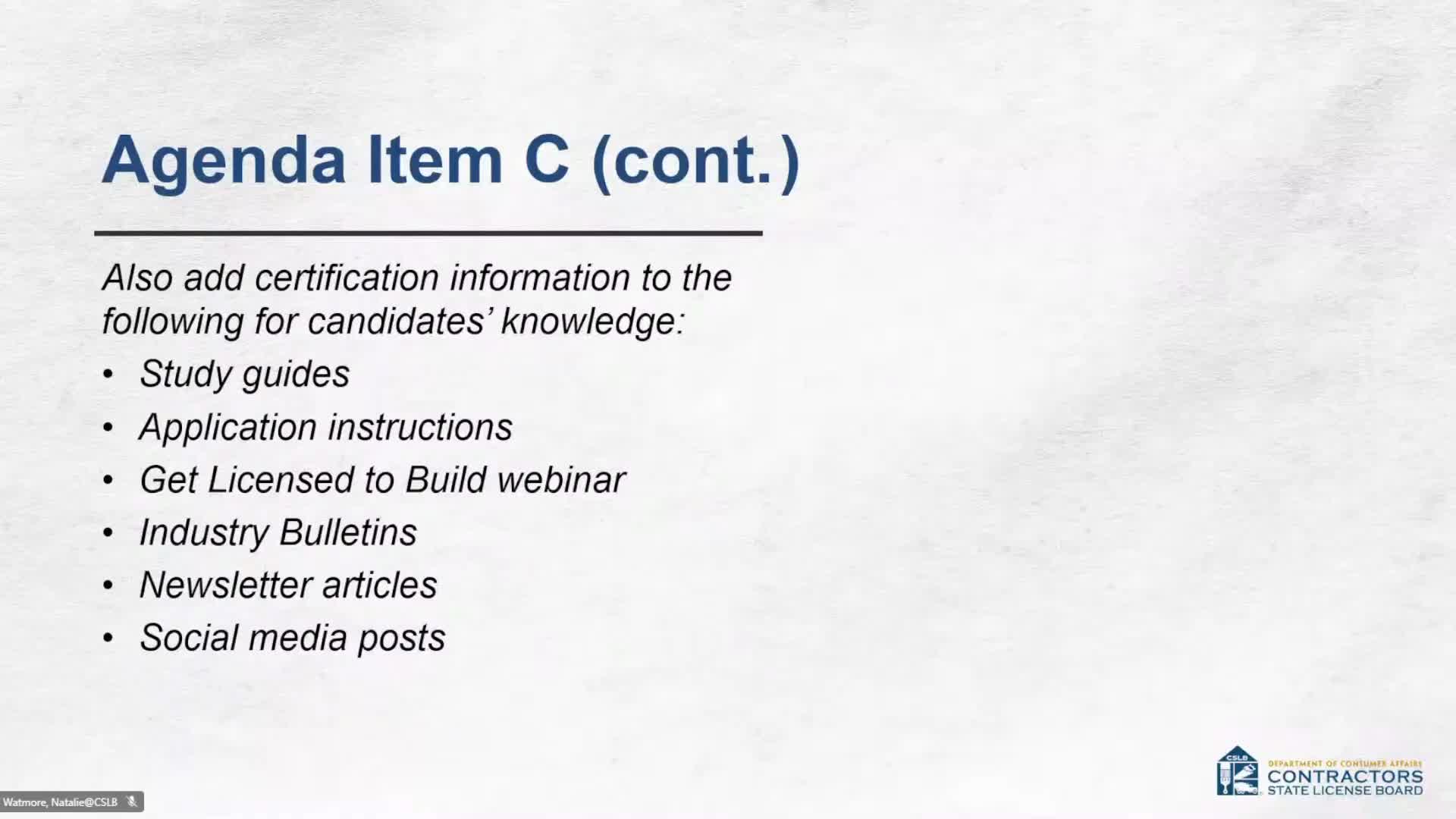 Committee members asked about current exam requirements (staff: B‑2 licensees take a specific B‑2 trade exam and the law exam) and about expected survey response rates; staff said their average survey response is about 10% but hoped the short format would yield a higher rate. Staff expects survey results to be ready for the March 2026 board meeting, at which time the full Board will consider options.