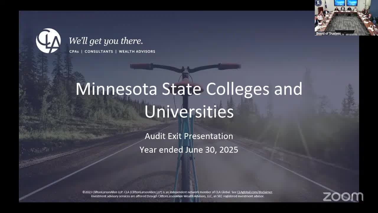 External auditors and internal audit briefed the Audit Committee on Nov. 20, reporting that independent auditors (CLA) issued unmodified opinions on the Minnesota State systemwide financial statements and the revenue fund despite a challenging Workday transition.