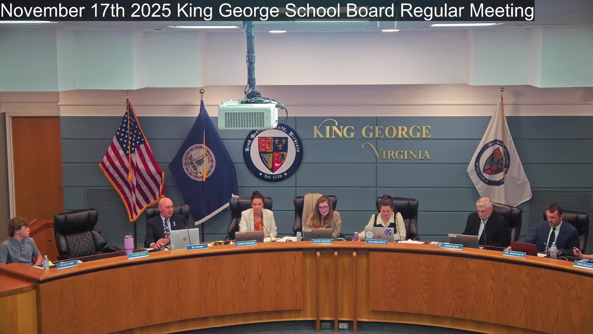 The King George County School Board unanimously accepted three Virginia Department of Education grants totaling $120,391.65 (security equipment, ACSE, early-childhood incentive), approved four donations, passed the five-year CIP submission to the county, and approved several policy updates and a regulation governing high-school noncurricular organizations.