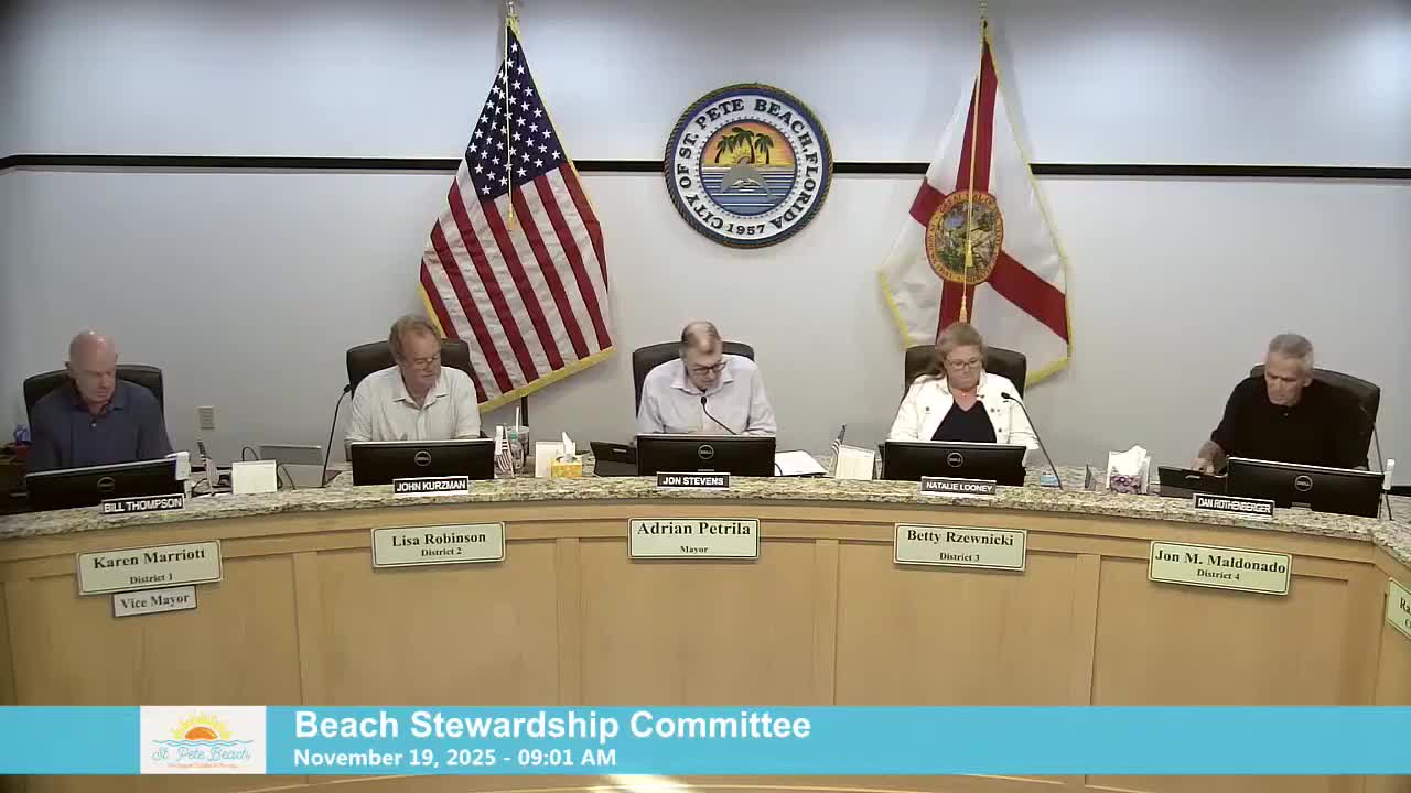 The Beach Stewardship Committee recommended a consolidated beach ordinance to the City Commission after debating sign rules, private vs. public beach land language, registration for commercial chair/cabana vendors, prohibitions on polystyrene/plastic straws and glass containers, micromobility rules, and wildlife protections.