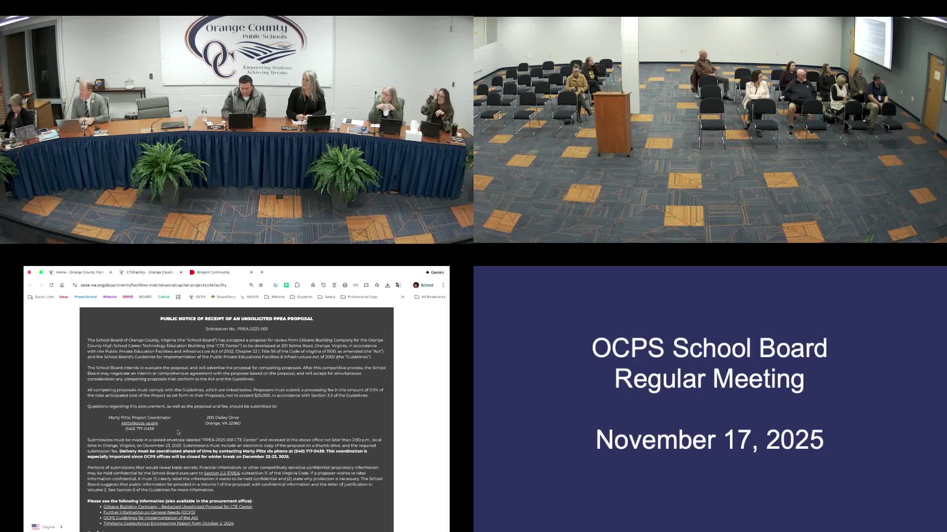 At a previous special called meeting (the transcript references that meeting on the 7th), the Orange County School Board accepted an unsolicited PPEA (Public‑Private Education Facilities and Infrastructure Act) proposal from Gilbane Building Company related to the planned CTE facility. At this regular meeting staff summarized the procurement steps and posted a public notice to invite competing contractors and architect teams to submit proposals.