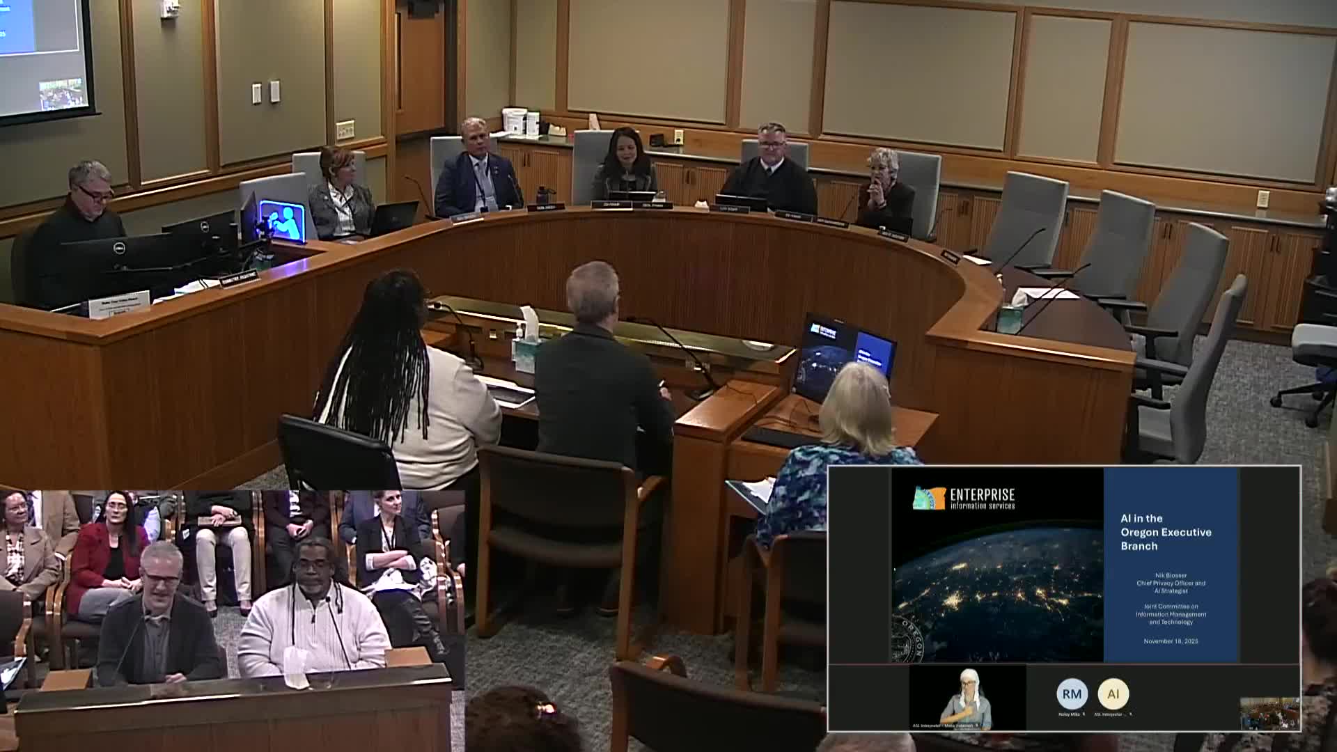 Nick Blosser, Oregon’s chief privacy officer and AI strategist, briefed the committee on privacy work and AI guidance focused on prohibiting regulated data in generative AI, requiring human oversight of AI outputs, maintaining an approved tools list, and building training and governance frameworks.