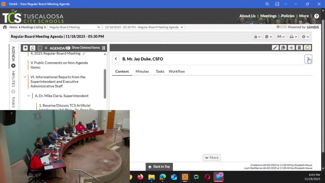 The Tuscaloosa City Schools board approved multiple agenda items by voice vote at its Nov. 18 meeting, including personnel changes, a voluntary early-retirement notification payment, facility improvements and updated rental rates.