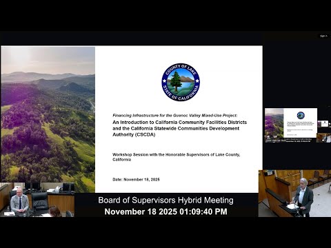 Developers and CSCDA told the Lake County Board of Supervisors that a Community Facilities District (CFD) would fund roads, utilities and parks for the Gwinoc Mixed Use Project through special taxes on properties inside the development; presenters said CSCDA would issue bonds and Lake County would not assume debt liability. The board directed staff to return Dec. 9 with a resolution to consider.