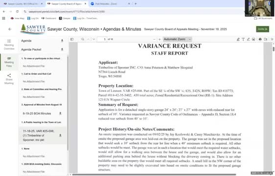 The Sawyer County Board of Appeals on an evening hearing approved Variance 25006, permitting a reduced rear lot‑line setback from 40 feet to 10 feet for a proposed detached garage at 12141 N Wagner Circle. The board attached conditions including a maximum overall height of 16 feet from grade to peak, that the structure not exceed the requested dimensions, and that it not be converted to living space.