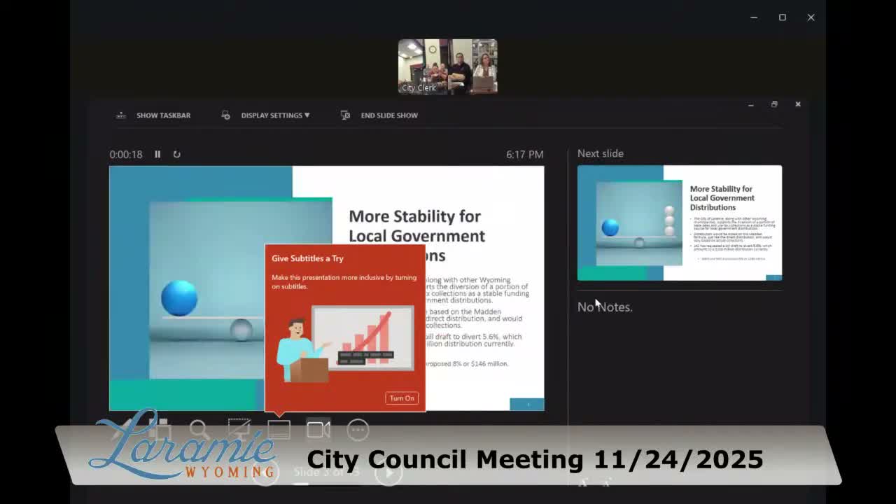 City financial staff briefed state legislators Nov. 24 on proposals to stabilize local government distributions — including a draft to divert a fixed share of state sales and use taxes — and stressed potential trade-offs for Laramie residents, infrastructure and local option taxes.
