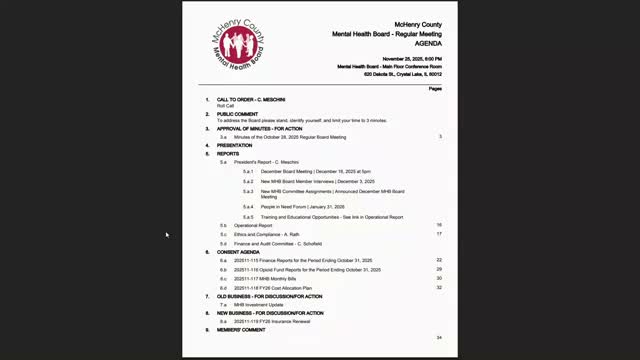 The McHenry County Mental Health Board completed routine business, approving the prior meeting minutes and a consent agenda of items 6A–6D. The chair called for a motion to approve the minutes; the motion was made and seconded and the board announced the motion passed. Later the consent agenda was moved, seconded and approved by roll call.