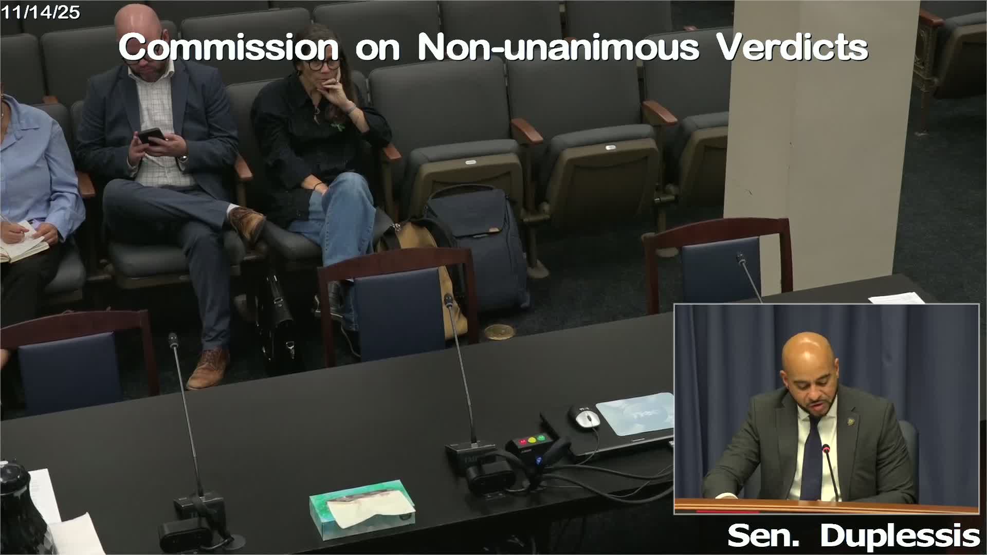 The Commission on Non‑Unanimous Verdicts opened its first meeting to begin implementing Senate Resolution 183, which directs the panel to establish methods for collecting court records, legal filings and jury polling slips and to accept case submissions from incarcerated people who believe they were convicted by a non‑unanimous jury.