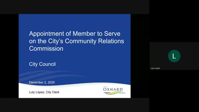 City Clerk Luli Lopez recommended that the mayor, with council concurrence, appoint Renee Camper Stewart to represent District 4 on the City of Oxnard's Community Relations Commission; Lopez said the nominee passed the city’s background check and staff will bring additional nominations on a rolling basis.