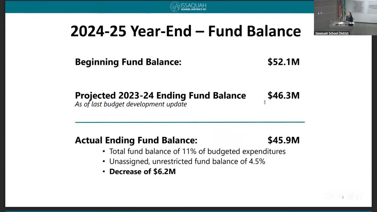 Issaquah School District finance staff presented a 2024–25 financial update and options for the 2026–27 budget development guidelines during the Nov. 13 meeting.