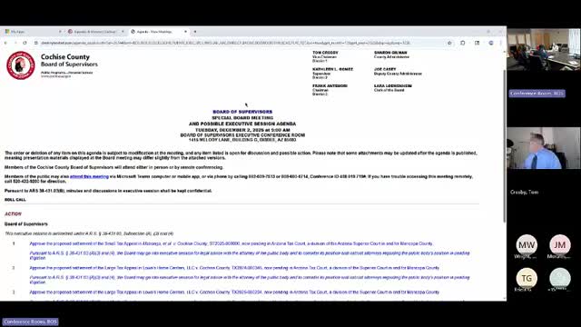 After a closed executive session, the Cochise County Board of Supervisors voted unanimously (3-0) to approve settlements in a small tax appeal (Matranga et al. v. Cochise County, ST 20250006) and two large Lowe's Home Centers LLC appeals (TX 2024-00346 and TX 2025-000234).