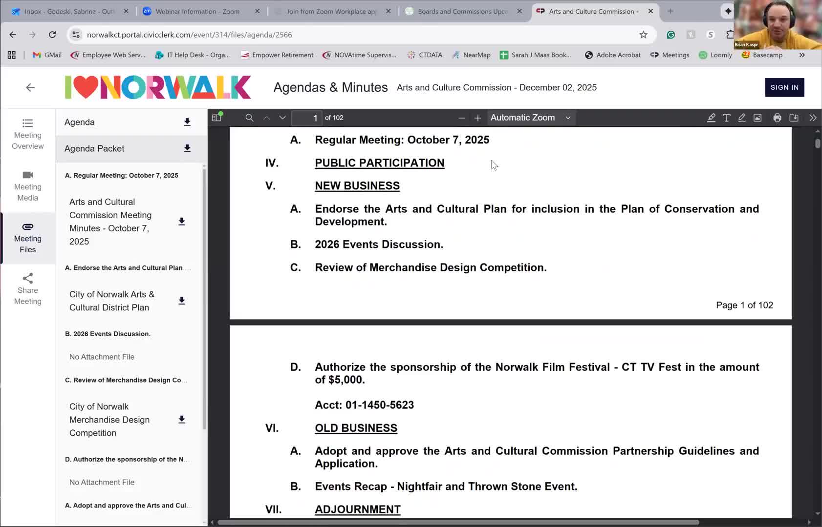 Votes at a glance - Motion to endorse Arts and Cultural Plan: carried by roll call (endorsed to move into the Plan of Conservation and Development review process). - Prior meeting minutes: approved (roll call recorded; one abstention). - Partnership/application process (see separate item): approved (see separate article).