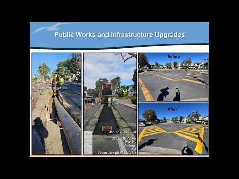 On infrastructure, the mayor said the Ventura Road sewer replacement was completed, a project described as critical to citywide wastewater reliability. The city is transitioning crosswalk markings near schools to durable thermoplastic ladder‑style striping to improve visibility and longevity.