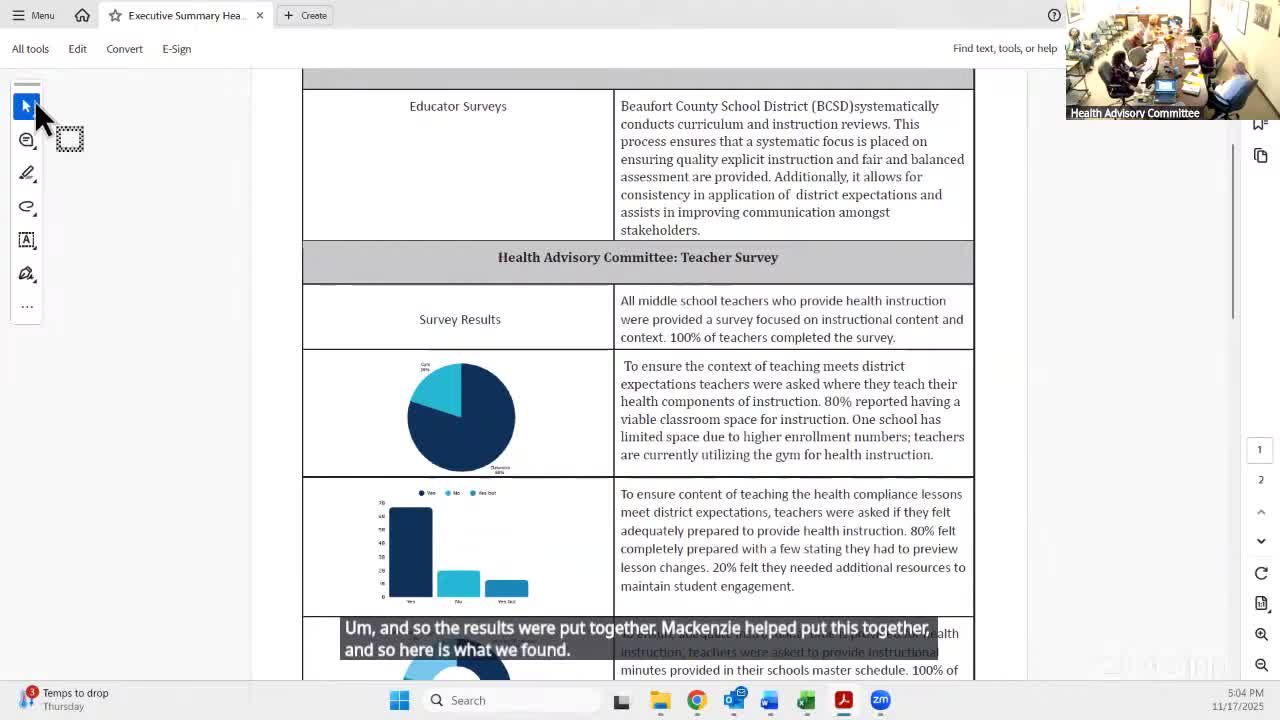Miss Emily, presenting results of a teacher survey to the Beaufort County Health Advisory Committee on Nov. 17, said the survey of middle-school PE/health teachers showed 80% of respondents reported having a classroom space for health instruction and 80% said they felt adequately prepared, while roughly 20% requested additional materials.