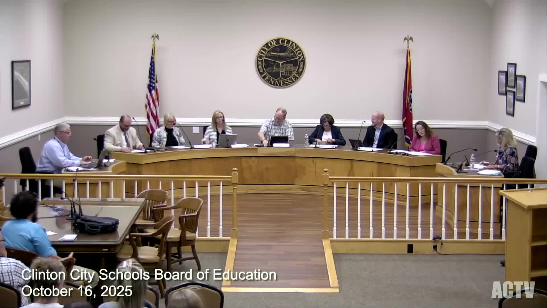 At a Clinton City School Board meeting, David Coffey presented a $10,000 leadership award to Monica Veil and praised North Clinton Elementary’s gains in K–3 literacy and third-grade proficiency, which district staff said exceeded state goals.