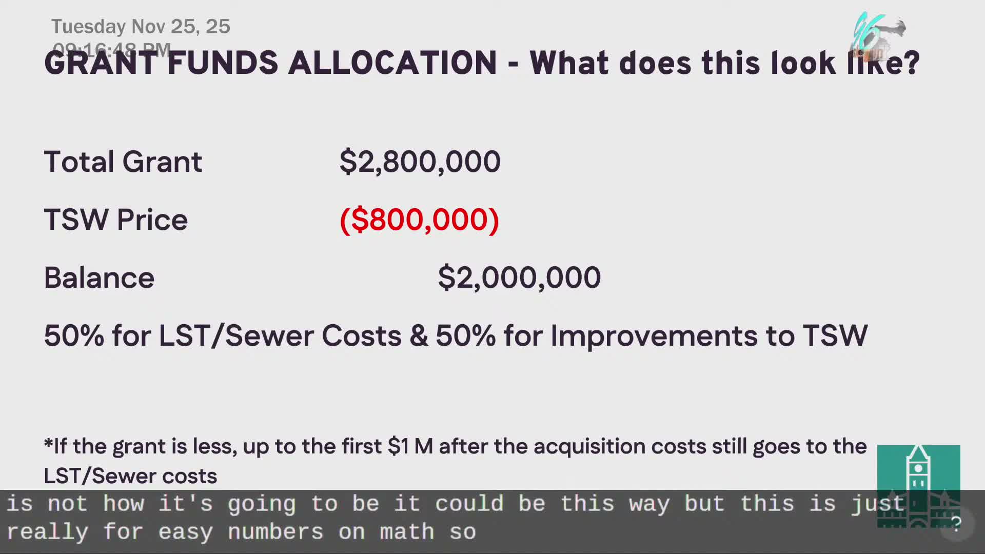 Mister Mazur, the city—s manager, told the Muskegon City Commission the package would prioritize acquisition first, then LST/sewer relocation, and finally wharf improvements. "So the total grant's $2,800,000," he said, walking commissioners through an illustrative example that assumed a 3rd Street Wharf valuation of $800,000 and a remaining $2,000,000 to split for other work.