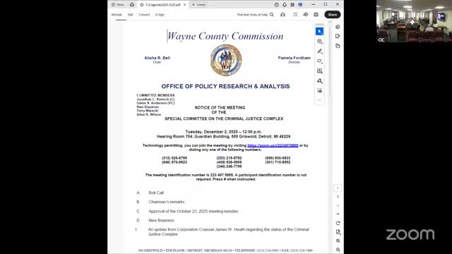 The Wayne County Commission Special Committee on the Criminal Justice Complex was told the long‑planned wayfinding (signage) project is starting, with consultant Nicholson visiting the facility on Dec. 11 for a site tour and a 3 p.m. stakeholder meet‑and‑greet; commissioners approved routine minutes and adjourned.