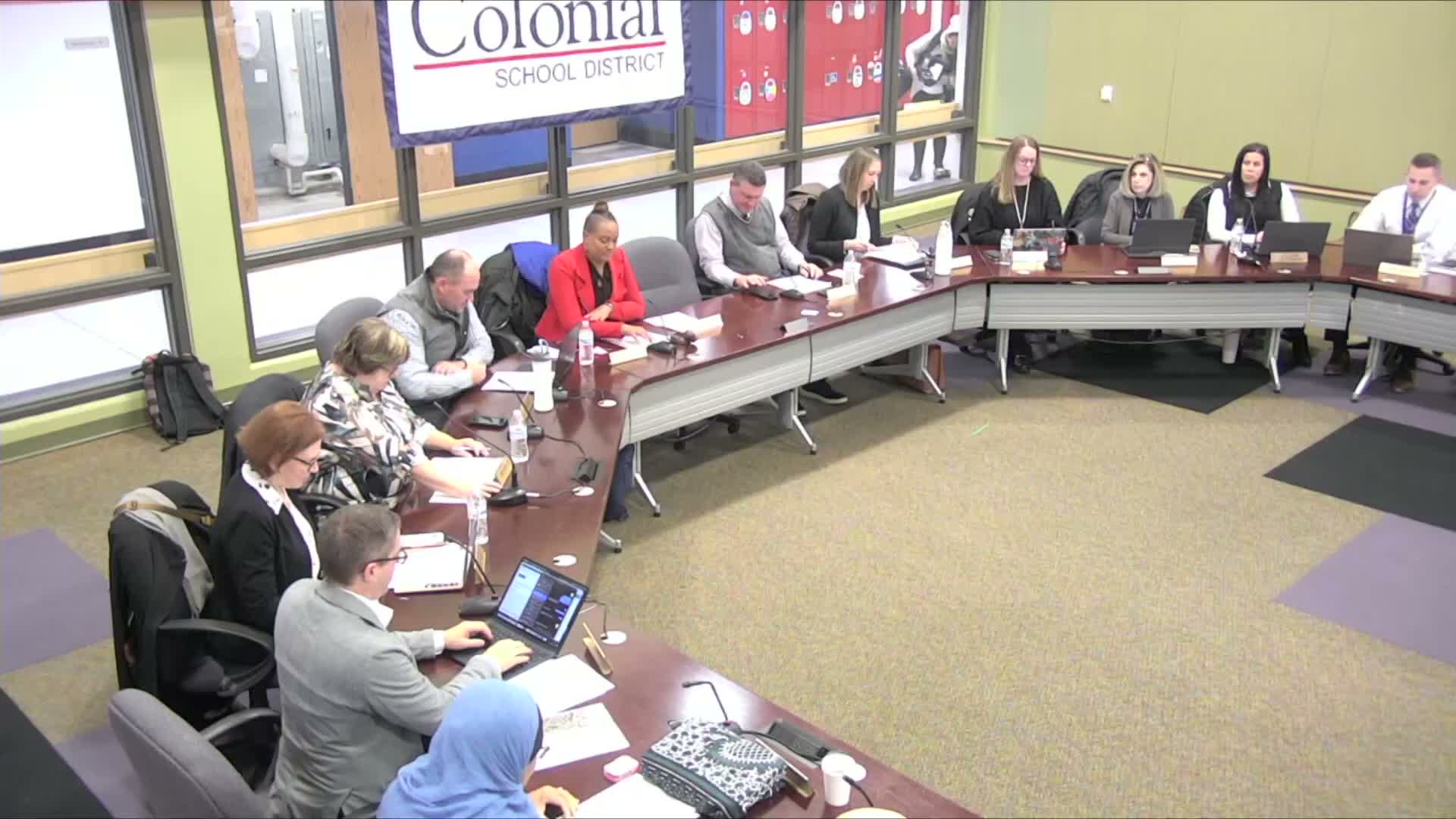 At its annual reorganization meeting the Colonial School District swore in four newly elected directors, elected Beth Petruno president and Gail Plant vice president for one-year terms, authorized continued use of existing signature plates, approved personnel actions and settled an assessment appeal; the board recognized two championship teams.