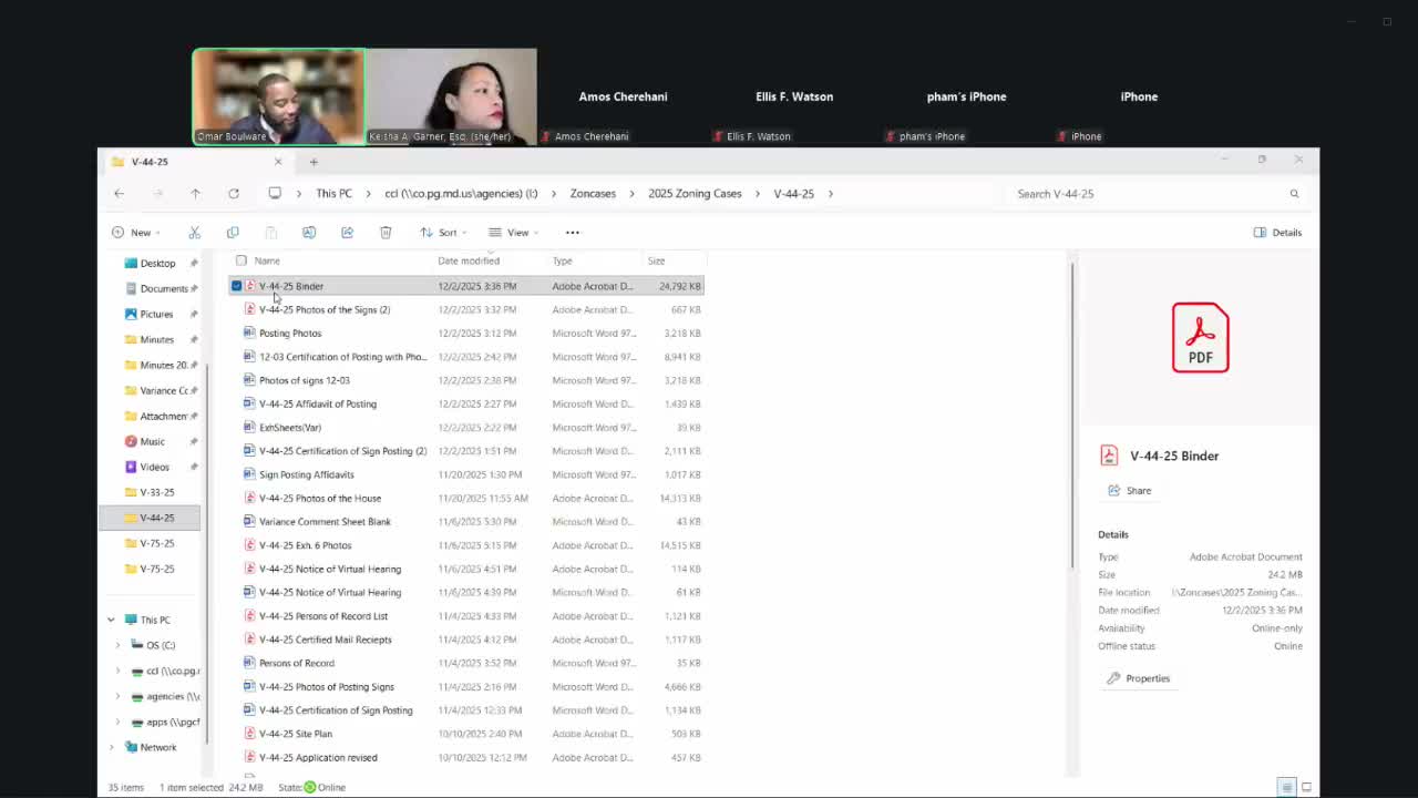 Two cases were called but not heard to completion: V33-25 (Bakuru Manenu) was called but the petitioner did not appear; the board excused the Swahili interpreter and said the case will be rescheduled if the petitioner does not appear. Case V34-25 (Jeanette Tesma) was delayed after the Amharic interpreter reported audio problems and the petitioner was not visible; the board excused the interpreter and planned to reschedule.