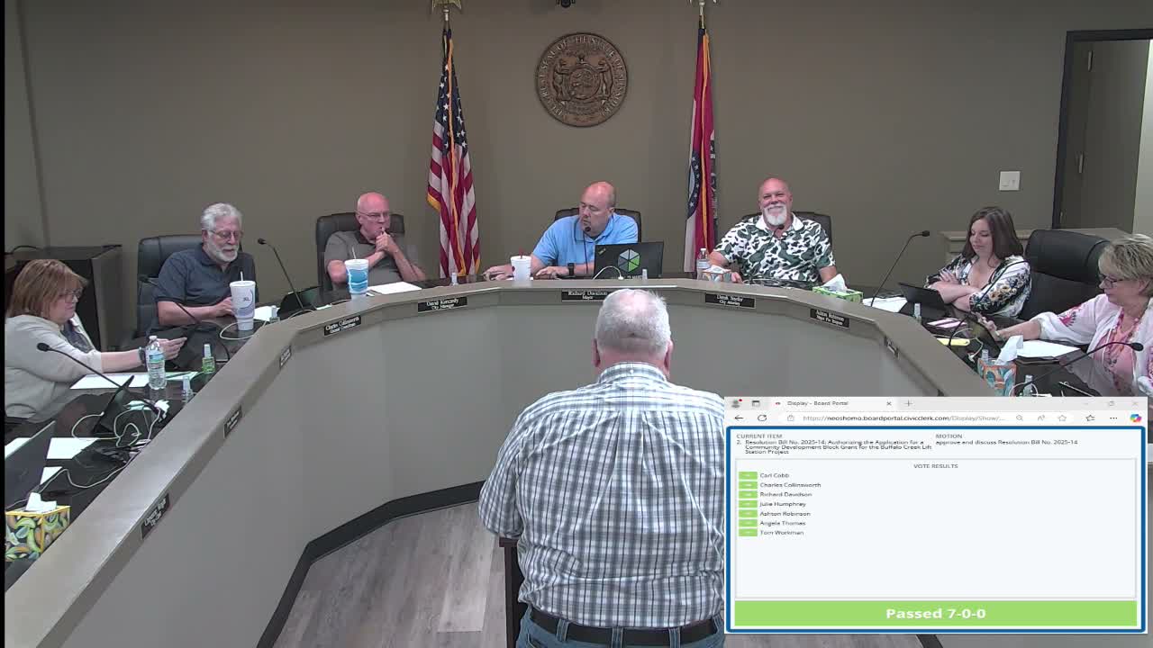 The Neosho City Council authorized applications and matching funds aimed at flood protection, including a Community Development Block Grant resolution tied to the Waldo Hatler Memorial Drive retention ponds; council approved the resolution by a 7-0 vote and staff outlined project cost estimates and needed local match.