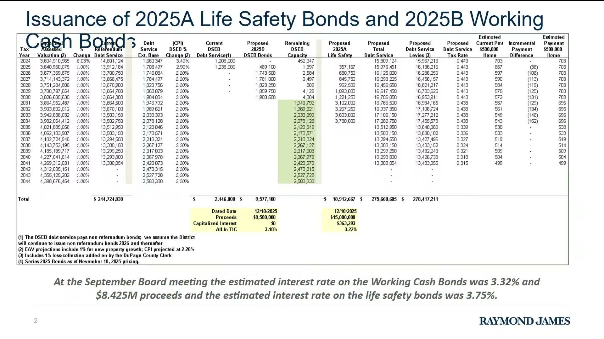 Elizabeth Hennessy, who presented the bond sale results, said the district issued Series 2025A life safety bonds repayable over 10 years at an interest rate of about 3.22% and Series 2025B working cash bonds repayable over 5 years at about 3.10%. Hennessy noted the district retained a double-A-plus rating from Standard & Poor's and that pricing compared favorably with similarly rated issuers in the market.