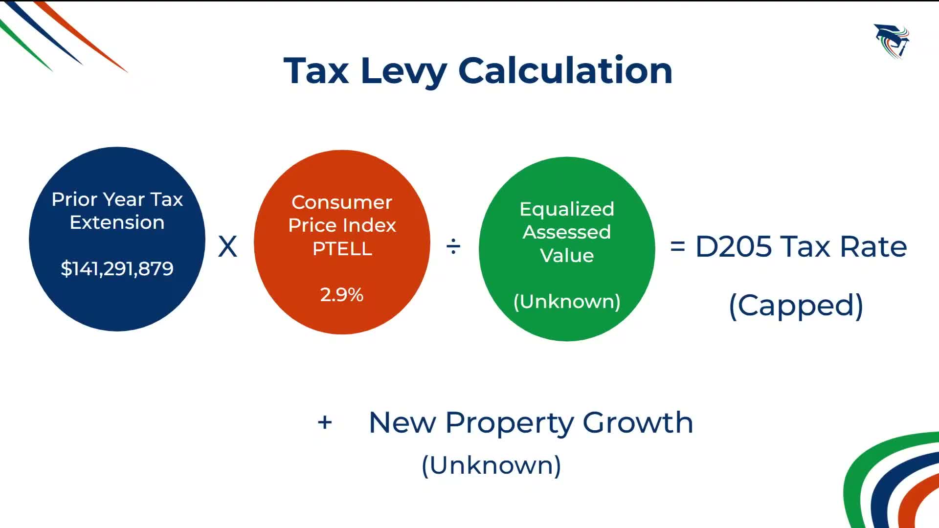 Mr. Blomquist, who led the presentation, said the district is starting from a prior extension of $141,291,879 and is using the consumer price index (CPI) of 2.9% (Dec. 2023–Dec. 2024) under PTELL rules. He said preliminary estimates of new property growth in the district are about $30,000,000 and that, combined with the CPI, produce a capped tax rate of roughly 3.7343 and a proposed levy up to $147,700,000.