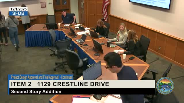 The board granted project design and final approval for a 752‑square‑foot second‑story addition at 1129 Crestline Drive. Architect Adam Grossons told the board the project includes interior renovations, a small skylight, updated landscaping and roof details; board members found the size, materials and setback modifications compatible with neighborhood character and approved the project with the standard findings. A 10‑day appeal period was announced.