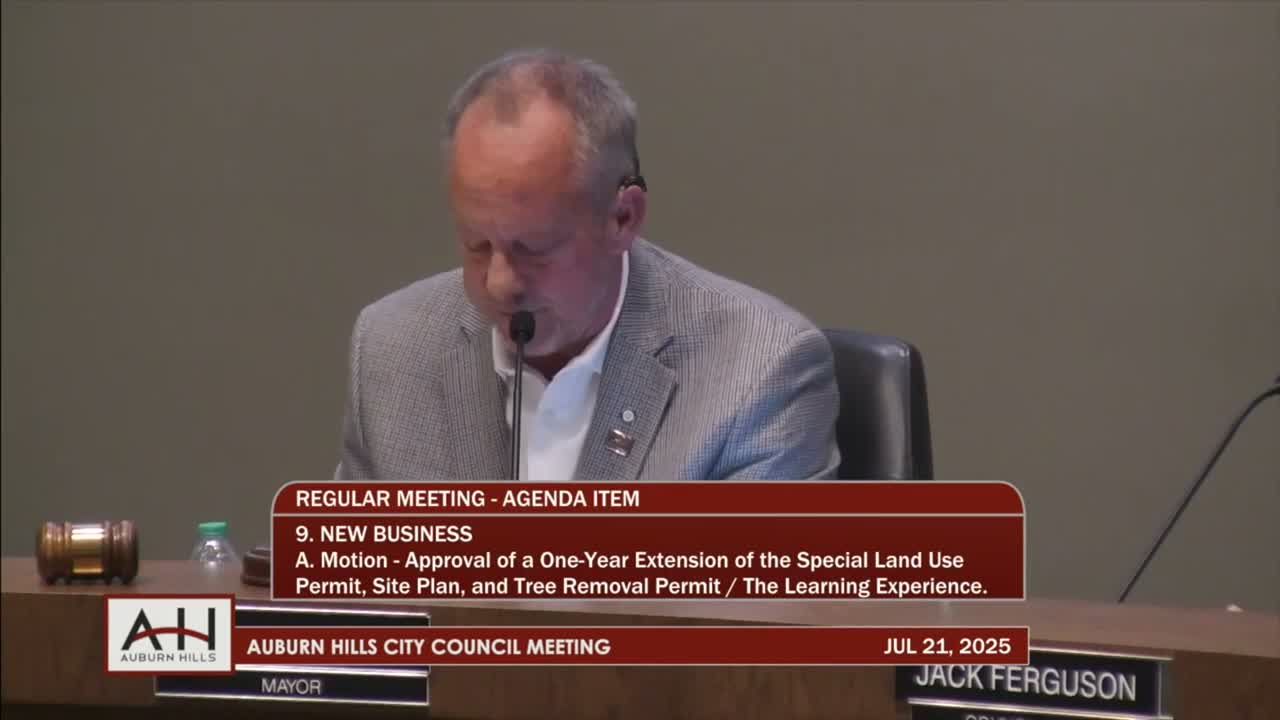 The council granted a one-year extension of site-plan, special land-use and tree-removal approvals for a proposed 10,000 sq ft Learning Experience childcare facility at 2635 North Squirrel Road after staff said the original developer withdrew over retaining-wall costs; a church representative said a new developer has been found and a sale is expected soon.